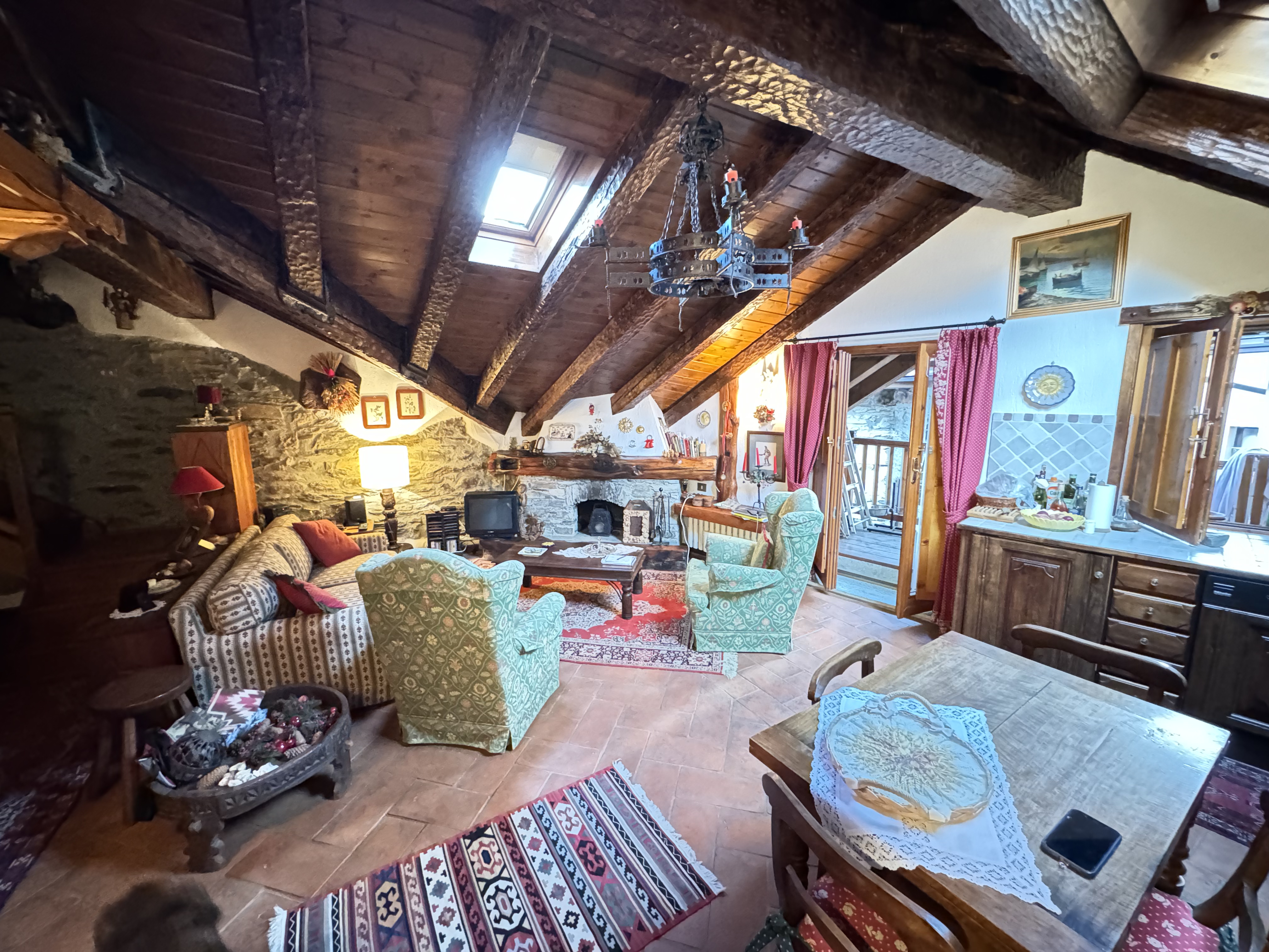 L’ingresso accoglie in un luminoso living con angolo cucina, impreziosito da uno scenografico camino che regala un’atmosfera calda, intima e ricercata. Il balcone rappresenta un angolo riservato dove respirare l’aria pura di montagna e godere della quiete del contesto.