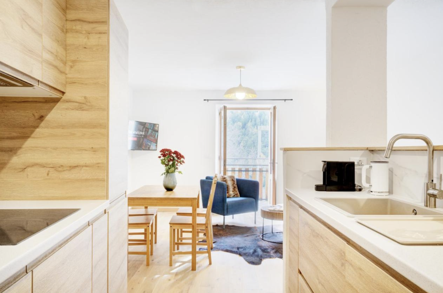 L’appartamento dispone di due camere da letto spaziose e 1 bagno moderno, ideali per famiglie. Il soggiorno luminoso, con cucina a vista, è il luogo perfetto per rilassarsi dopo una giornata sulle piste. Non dimenticare di goderti la vista mozzafiato dalle finestre e dalla terrazza, dove puoi sorseggiare un drink mentre ammiri il paesaggio alpino.
